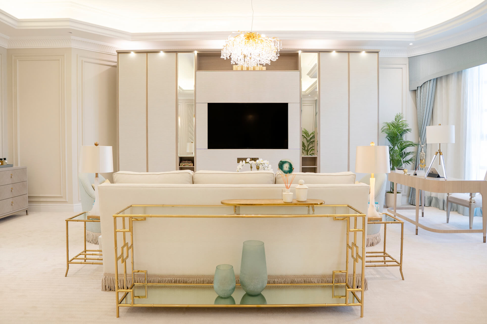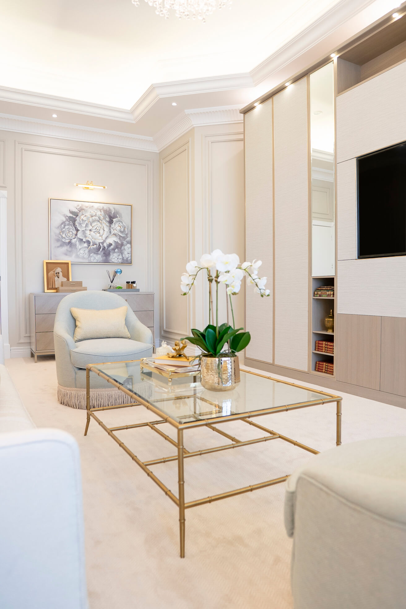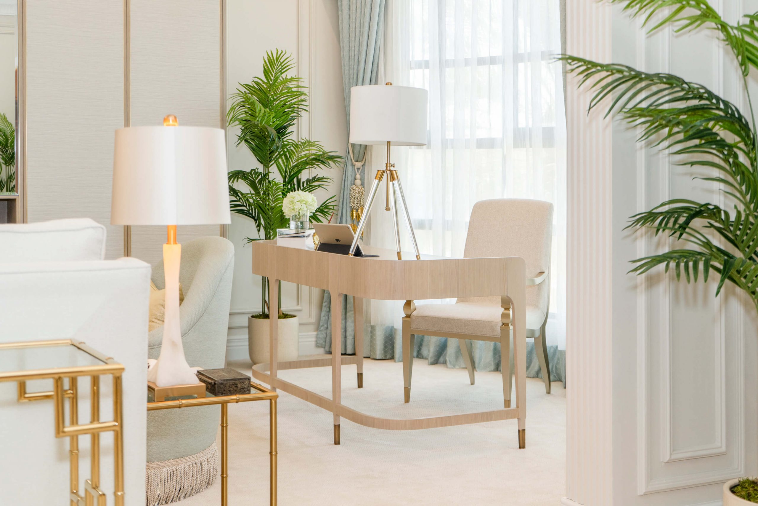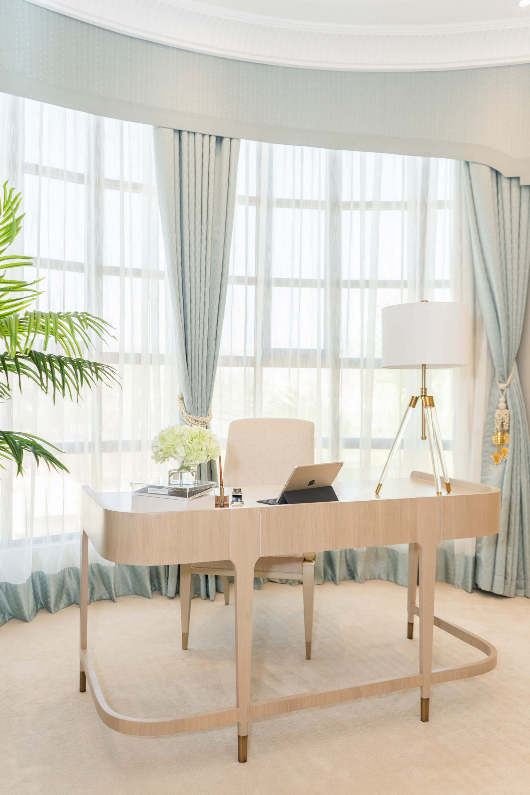 نظرًا لأن غرفة النوم كانت مساحتها كبيرة، فقد قام الفريق بتقسيم المساحة إلى مناطق مختلفة: إحداها عبارة عن منطقة مكتب مخصصة للعمل عن بُعد والاجتماعات عبر الإنترنت، والأخرى هي منطقة جلوس مخصصة للاسترخاء غير الرسمي والمحادثة والترفيه، ومنطقة أخرى مخصصة للنوم. بالإضافة إلى ذلك ، للحفاظ على المساحة مرتبة وأنيقة ، أنشأنا وحدة نجارة كبيرة وأنيقة مع مقصورات مخفية لتخزين المجوهرات والملابس بأمان.