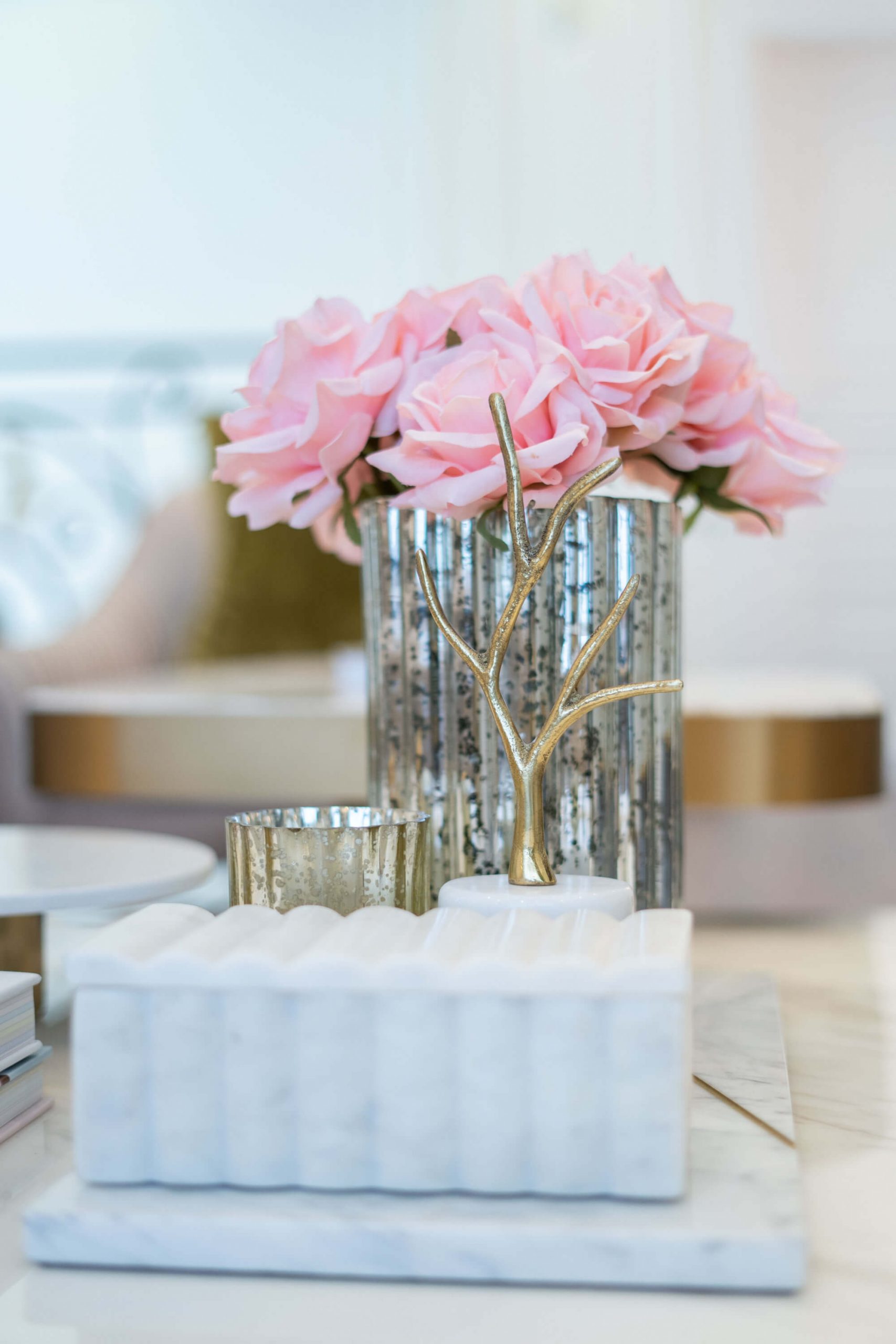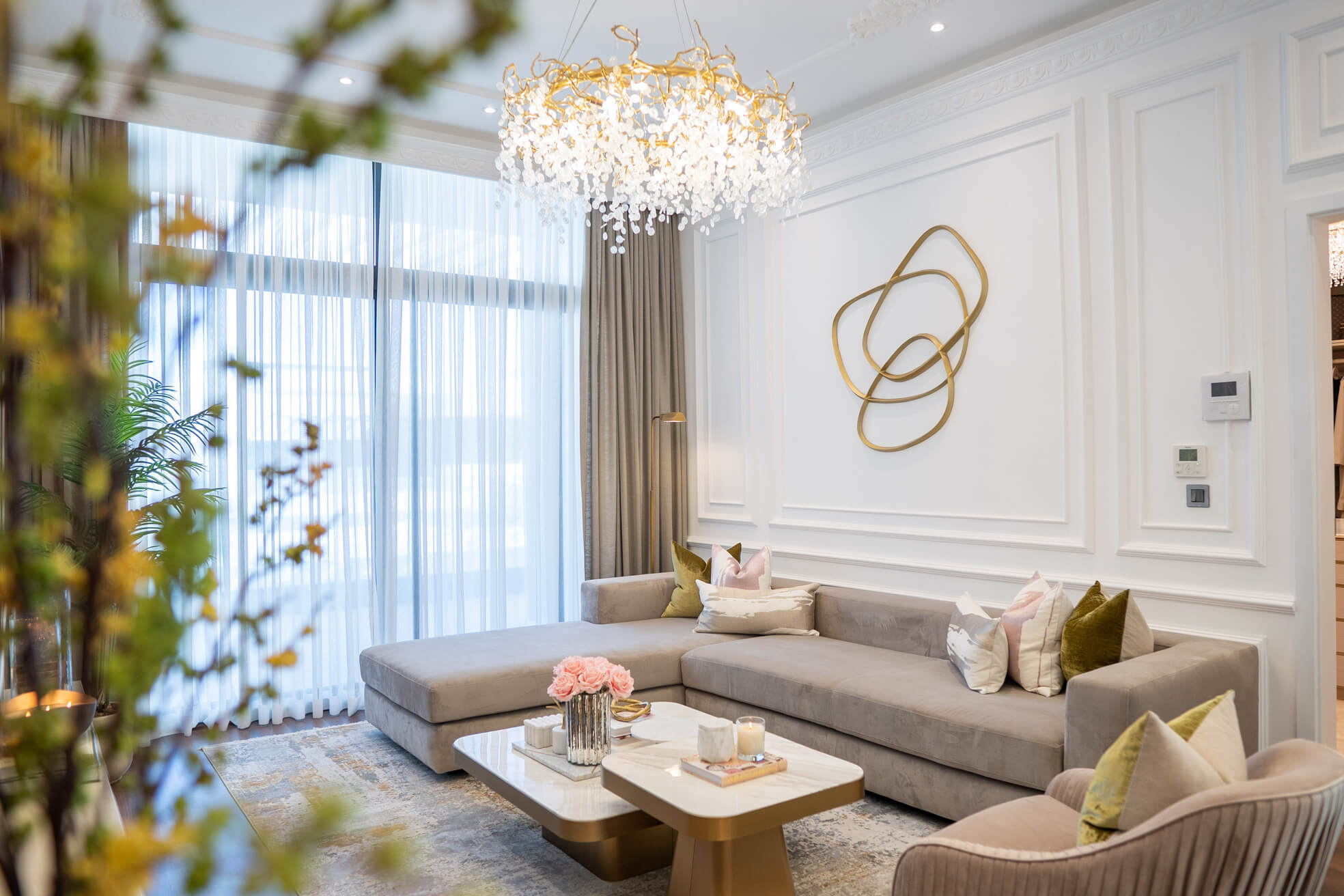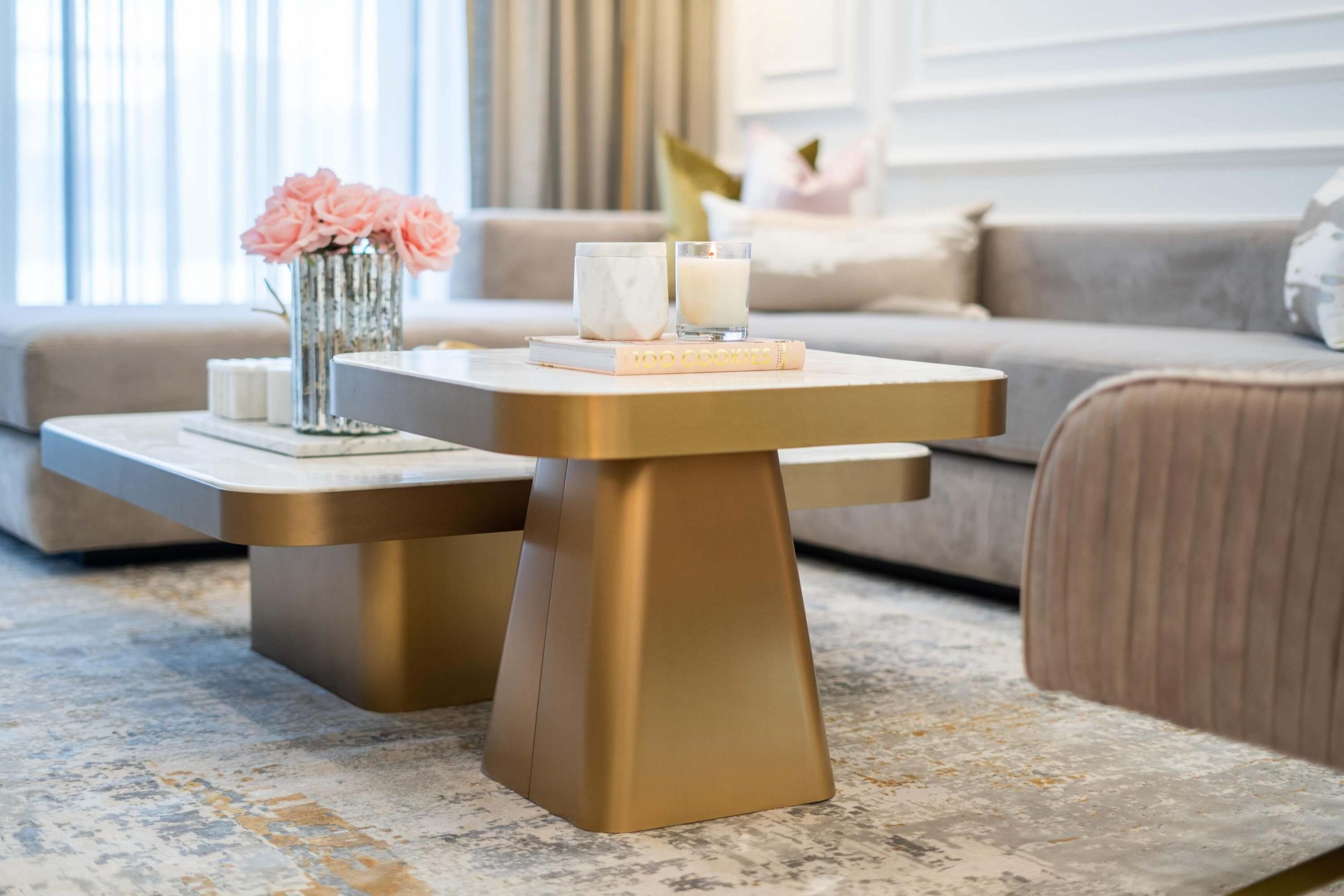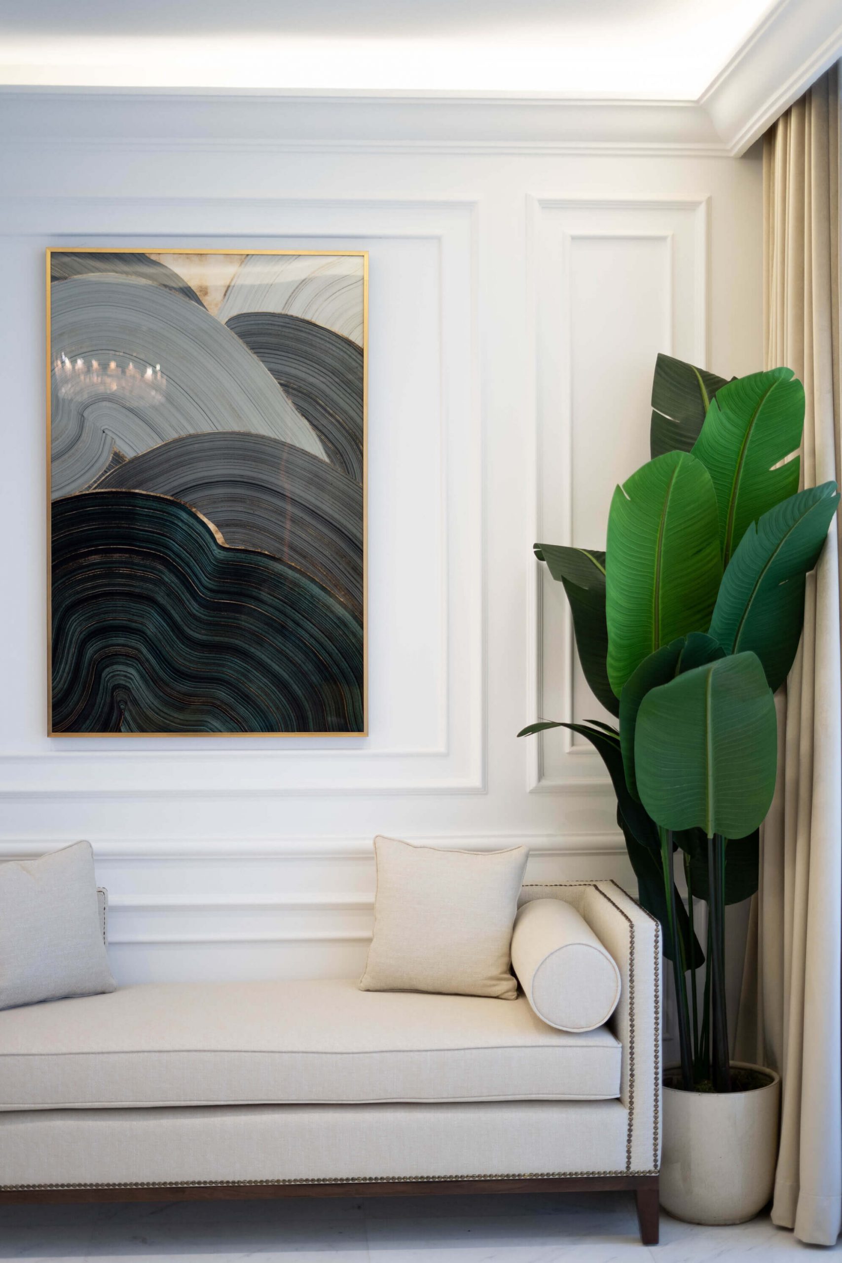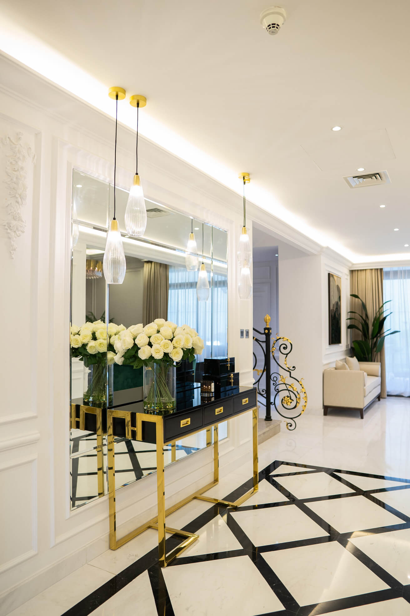 صُممت خزانة الملابس بتصميم محايد لتسليط الضوء على مجموعتها من الأحذية والحقائب والملابس المصممة، ولتوفير سهولة الوصول إلى العناصر التي تستخدمها بانتظام للسفر والسهرات. نظرا ً لأن العميلة لديها أيضا ً شغف بالموضة والجمال، فقد وضعنا أثاثًا استراتيجيًا مثل طاولة الزينة مع الأدراج، ومرآة، ومقعد يجعل ارتداء الملابس والاستعداد أكثر متعة. لقد قمنا أيضًا بدمج الدرجات الزهرية واللمسات الذهبية، والتي ترفع من تجربة البدوار إلى تجربة حالمة.
