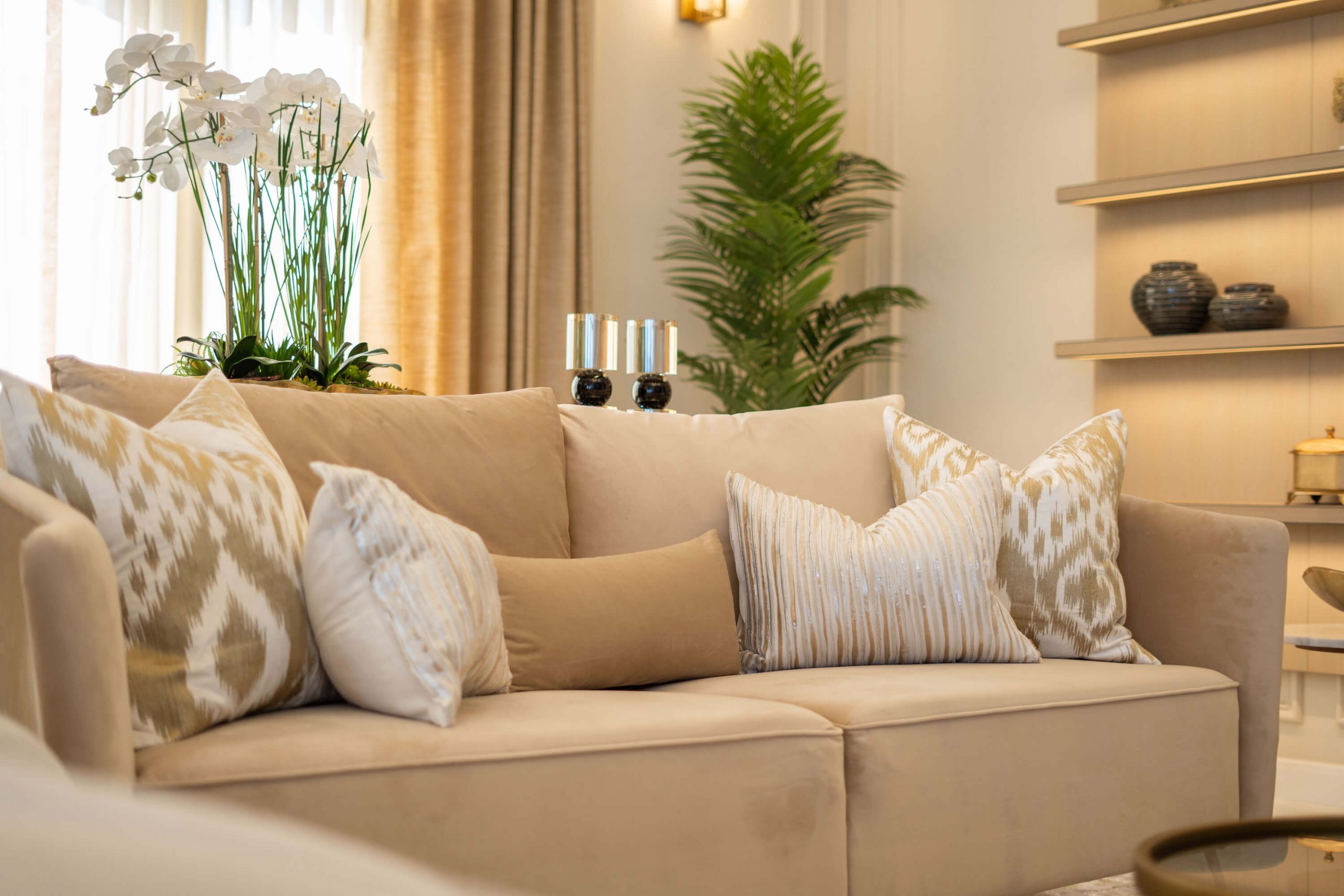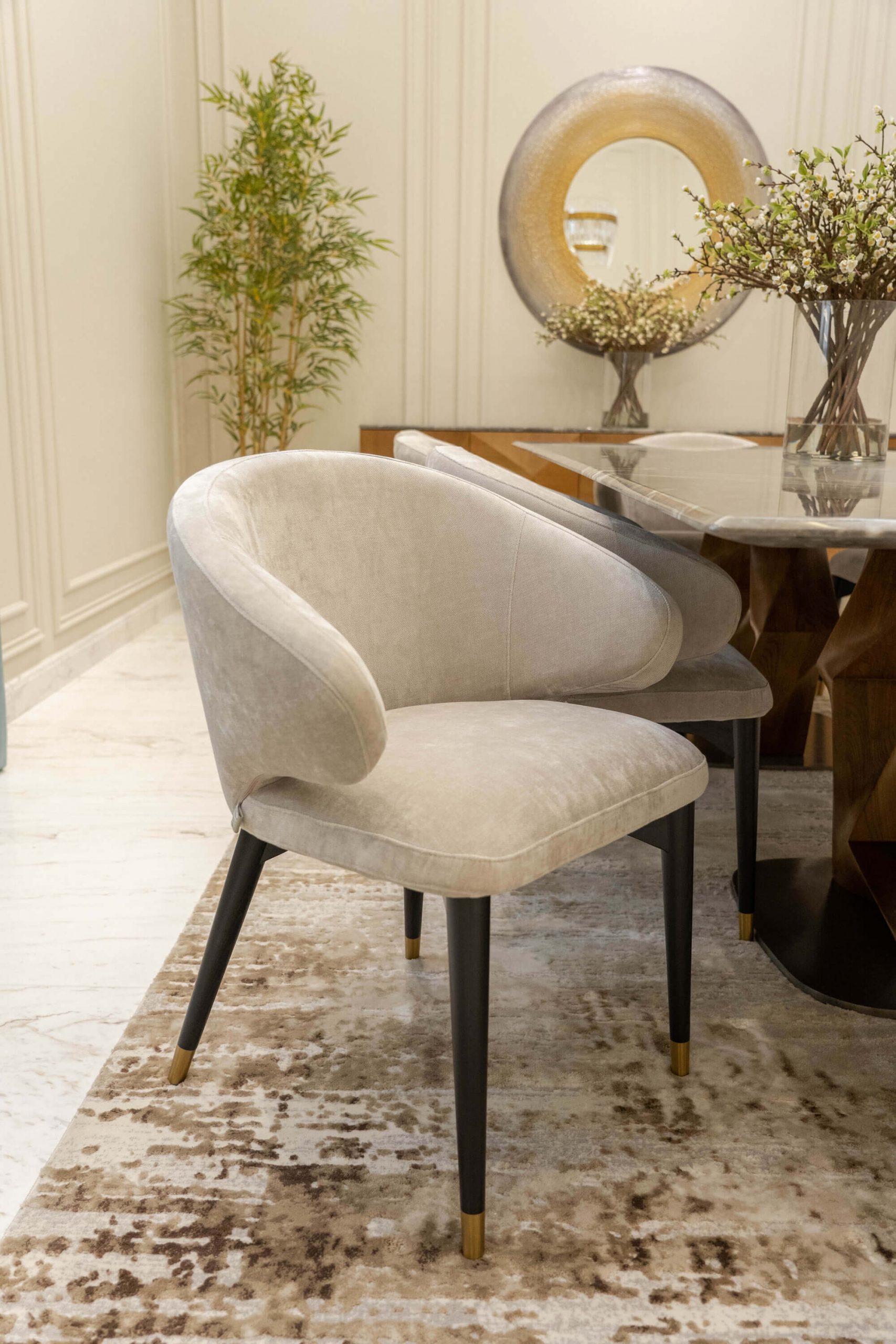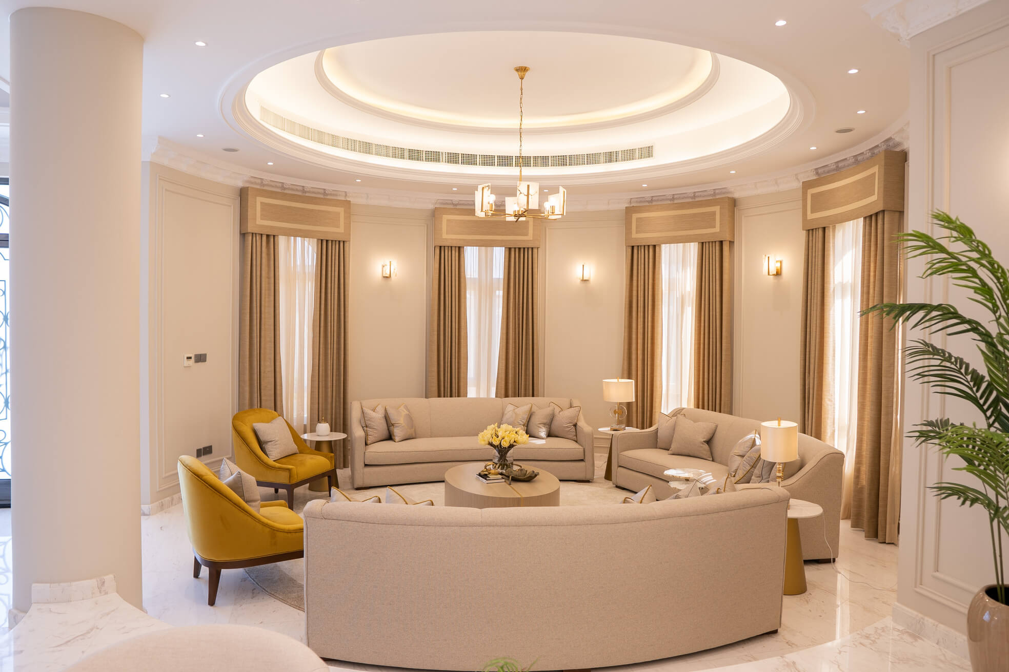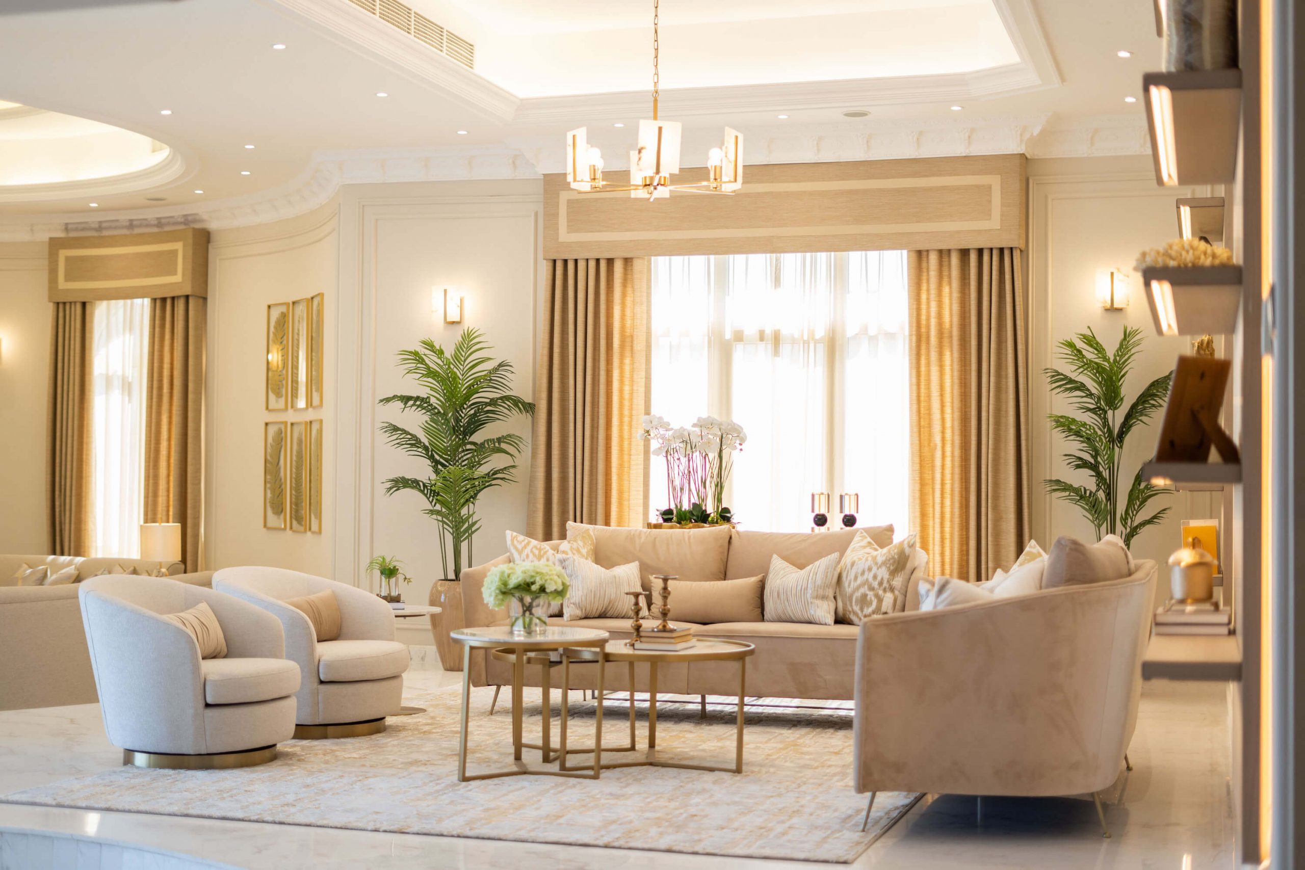 عندما اقتربنا من تجديد غرفة المعيشة في الفيلا، عملنا عن كثب مع العميل وقررنا أنه من الأفضل إعادة هيكلة المساحة لجعلها صالحة للعيش للعائلة. قمنا أيضًا بإعادة إنشاء وتجديد مساحة تناول الطعام لإضفاء مزيد من الجاذبية الرسمية. تم تصميم كلتا المنطقتين بألوان ترابية ، واللعب باللون البني والأصفر والرمادي ولمسات من الذهب، مع الحفاظ على شعورها المحايد والهادئ.