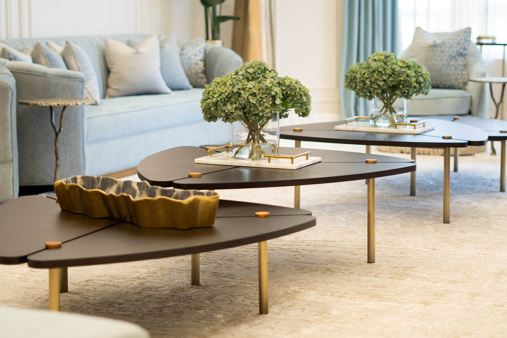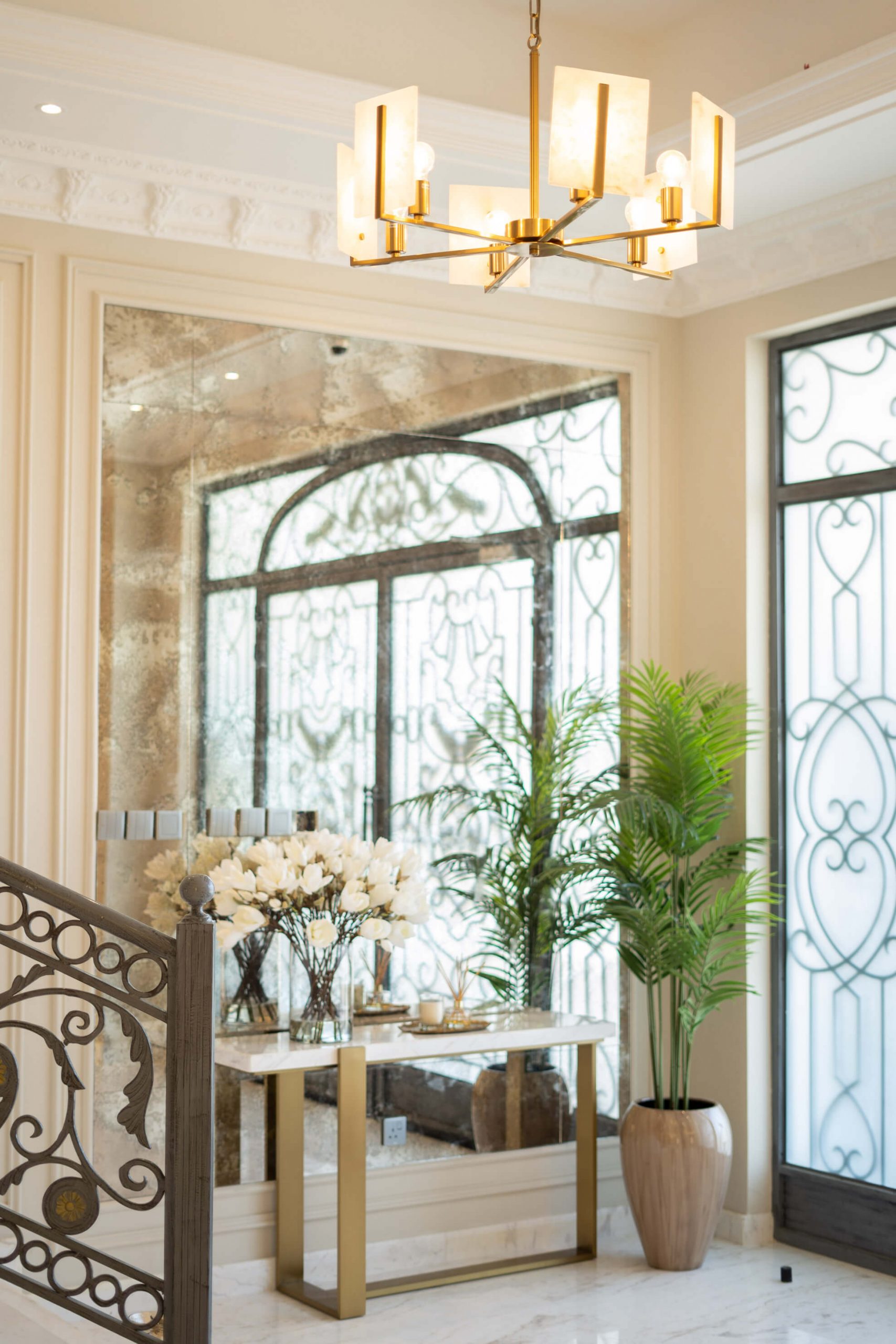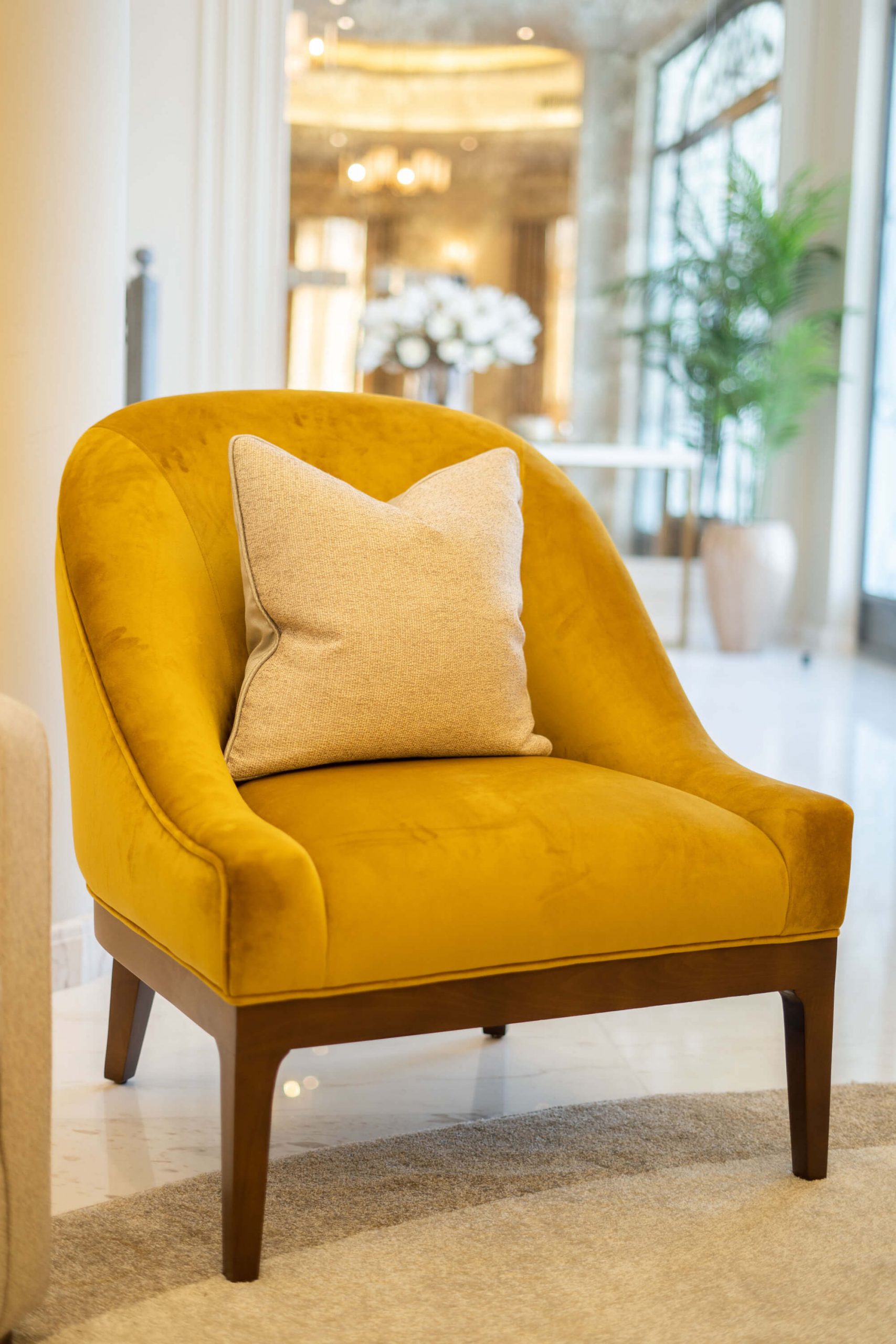عندما اقتربنا من تجديد غرفة المعيشة في الفيلا، عملنا عن كثب مع العميل وقررنا أنه من الأفضل إعادة هيكلة المساحة لجعلها صالحة للعيش للعائلة. قمنا أيضًا بإعادة إنشاء وتجديد مساحة تناول الطعام لإضفاء مزيد من الجاذبية الرسمية. تم تصميم كلتا المنطقتين بألوان ترابية ، واللعب باللون البني والأصفر والرمادي ولمسات من الذهب، مع الحفاظ على شعورها المحايد والهادئ.