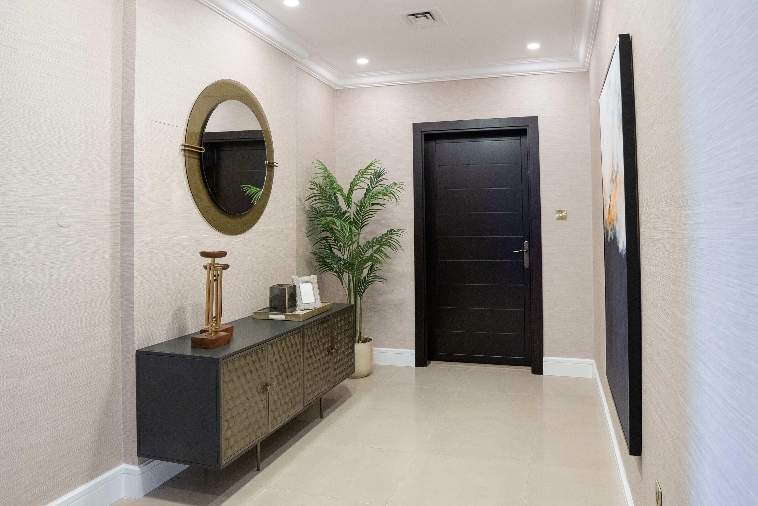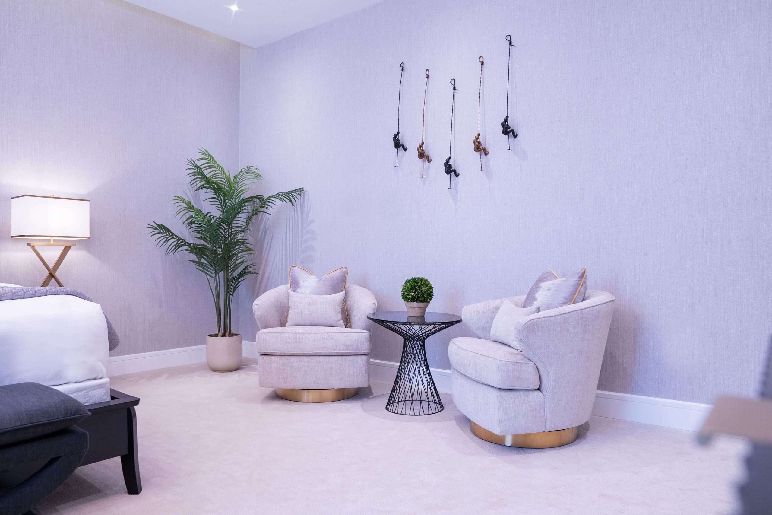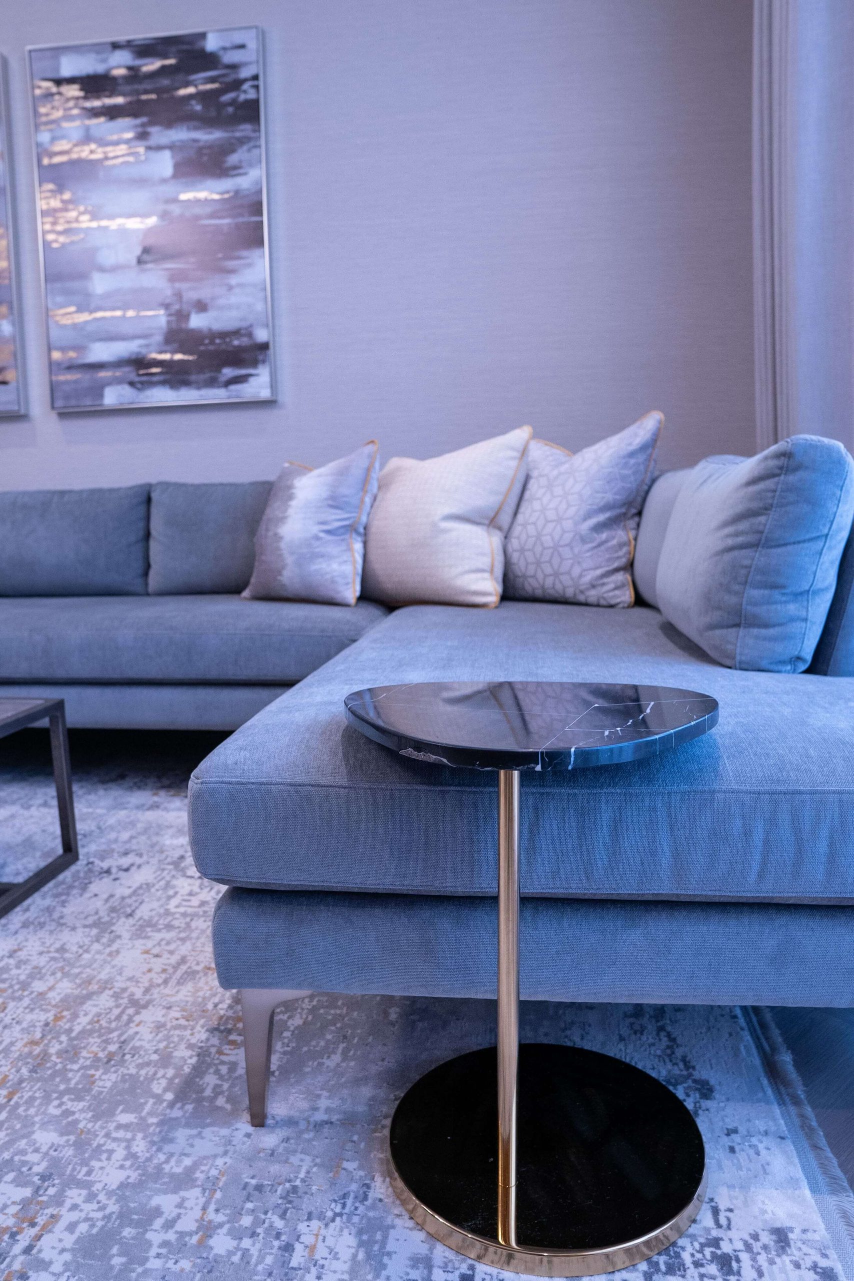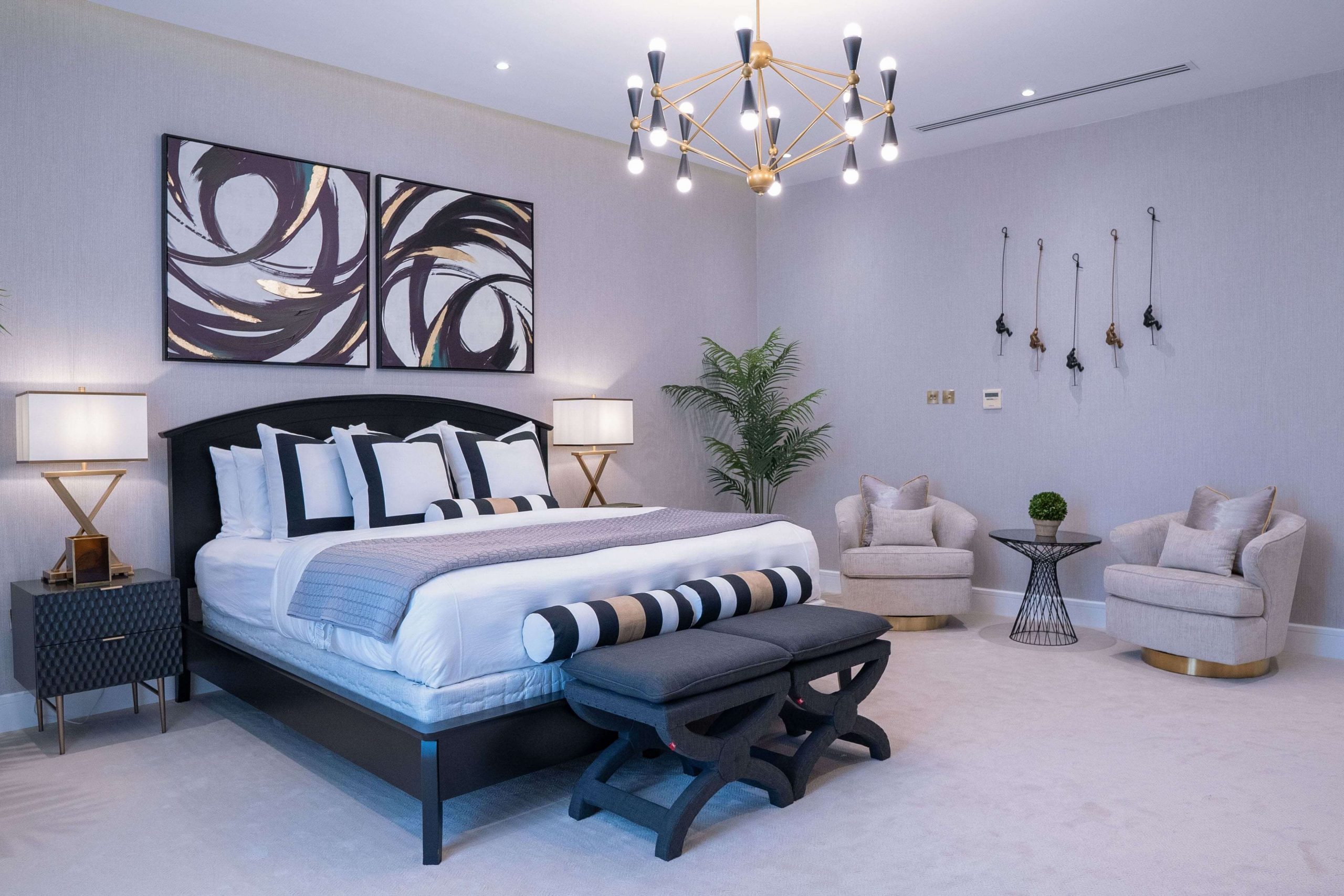 حولنا العديد من غرف نومه إلى غرفة معيشة حيث يريد المالك تخصيص مساحة أكبر للترفيه عن الضيوف في لقاءاته. بالإضافة إلى ذلك، قمنا بتحويل جزء من الحمام إلى غرفة ملابس لمزيد من المساحة المخصصة للمالك من أجل العناية الشخصية. لإضافة لمسة إلى منزله، قمنا بدمج اللمسات الذهبية في الخطوط الأنيقة من الأسود والأبيض والتشطيبات الصناعية لخلق نمط تصميم حديث إلى منتصف القرن.